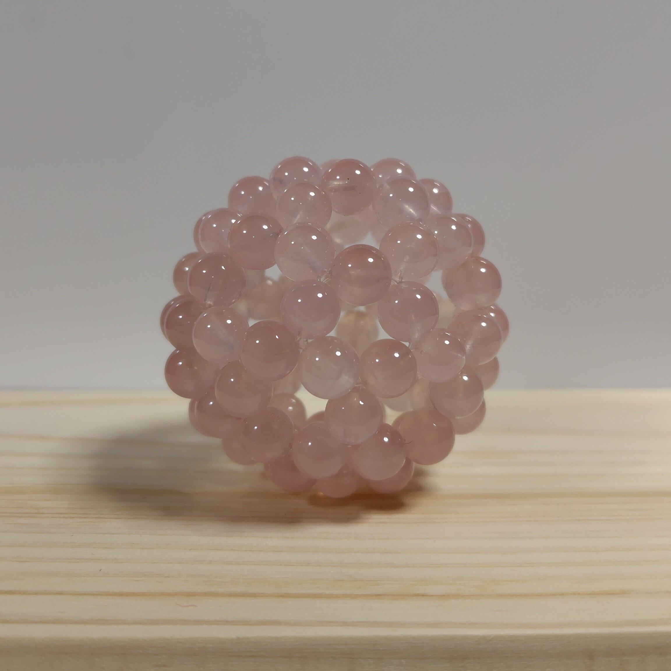 Crafted with 90 natural stone beads, this spherical structure is composed of 12 pentagons and 20 hexagons, forming a 32-sided shape that resembles a soccer ball.