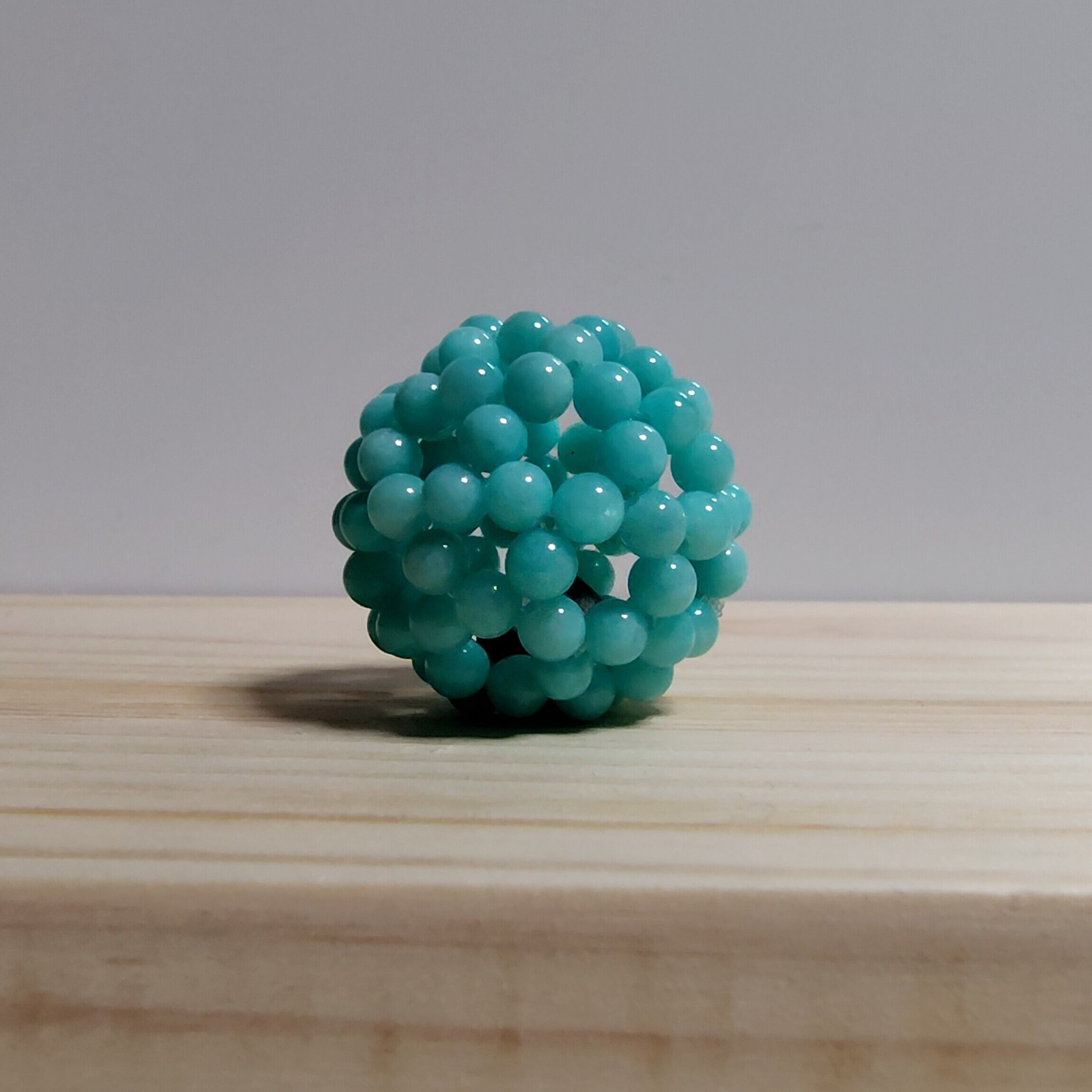 Crafted with 90 natural stone beads, this spherical structure is composed of 12 pentagons and 20 hexagons, forming a 32-sided shape that resembles a soccer ball.