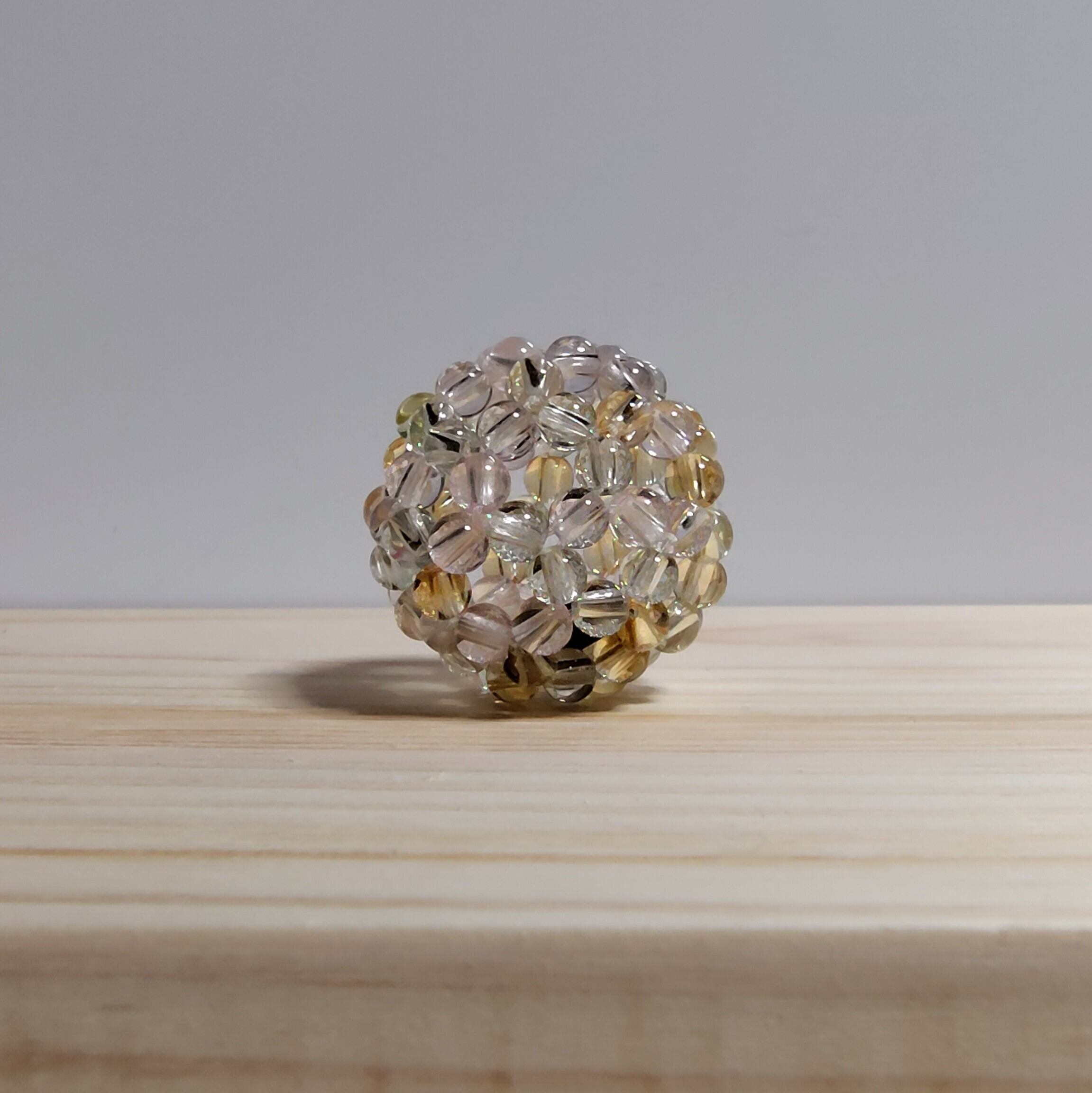Crafted with 90 natural stone beads, this spherical structure is composed of 12 pentagons and 20 hexagons, forming a 32-sided shape that resembles a soccer ball.